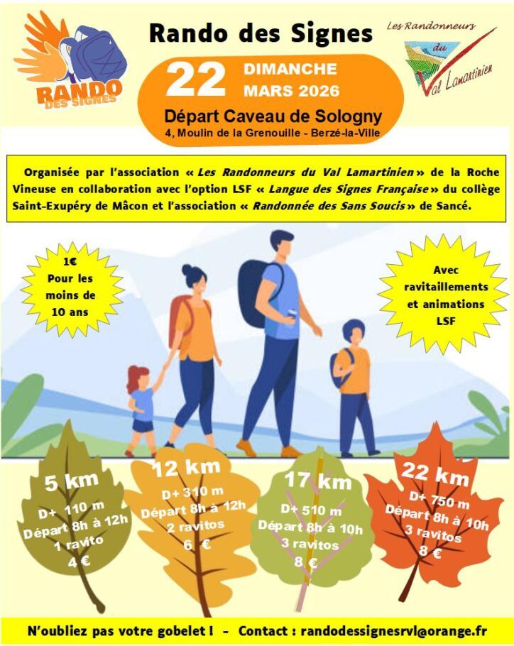 Elle est organisée par les associations des « Randonneurs du Val Lamartinien » de la Roche Vineuse et « Randonnée des Sans-Soucis » de Sancé en collaboration avec l’option LSF du collège Saint-Exupéry de Mâcon.